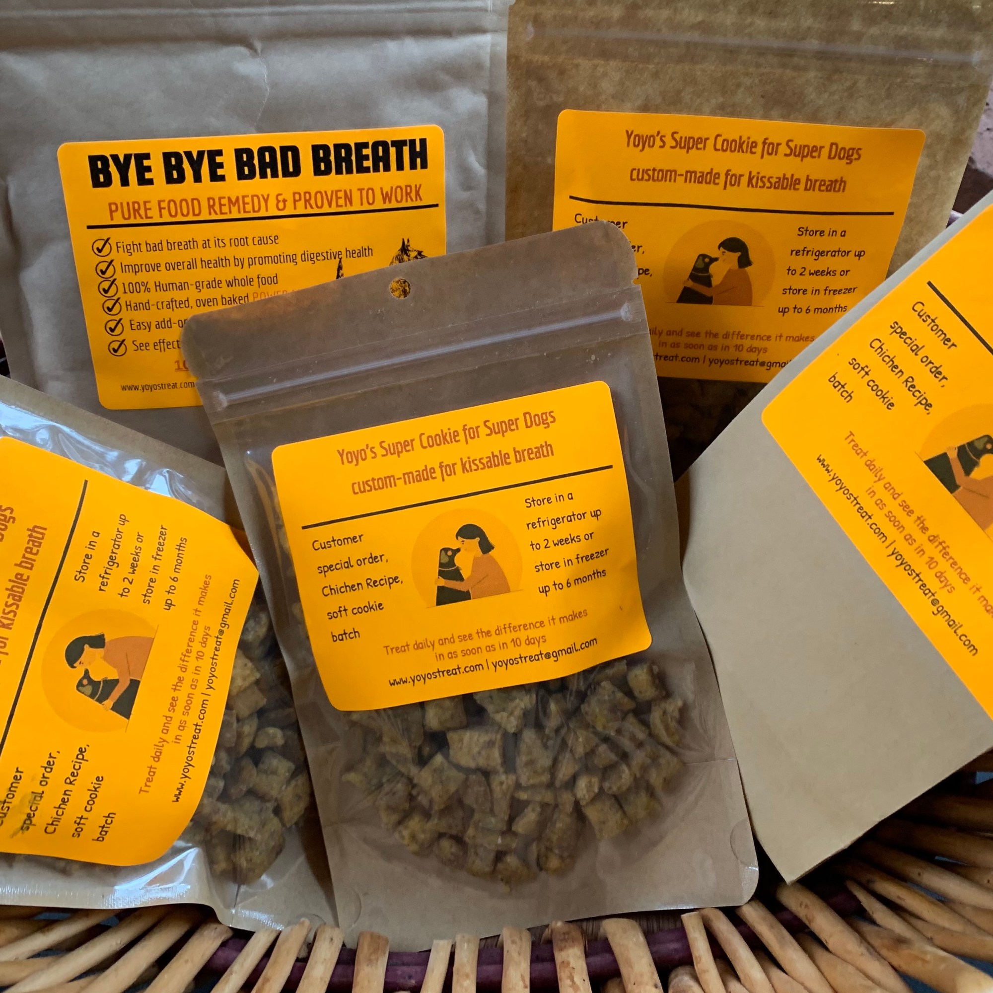 At Yoyo’s Breath Treat, we only make human-grade, functional treats for dog’s digestive and overall health. We only use quality, human-grade wholesome and functional ingredients. Each order is custom-made and each piece is carefully hand-crafted, freshly oven-baked, and gift-wrapped in delightful package for your fur babies. Yoyo’s Treat is Functional, Nutritious and Yummy. Treat your dog with Yoyo’s Cookie every day, see the difference it makes,
